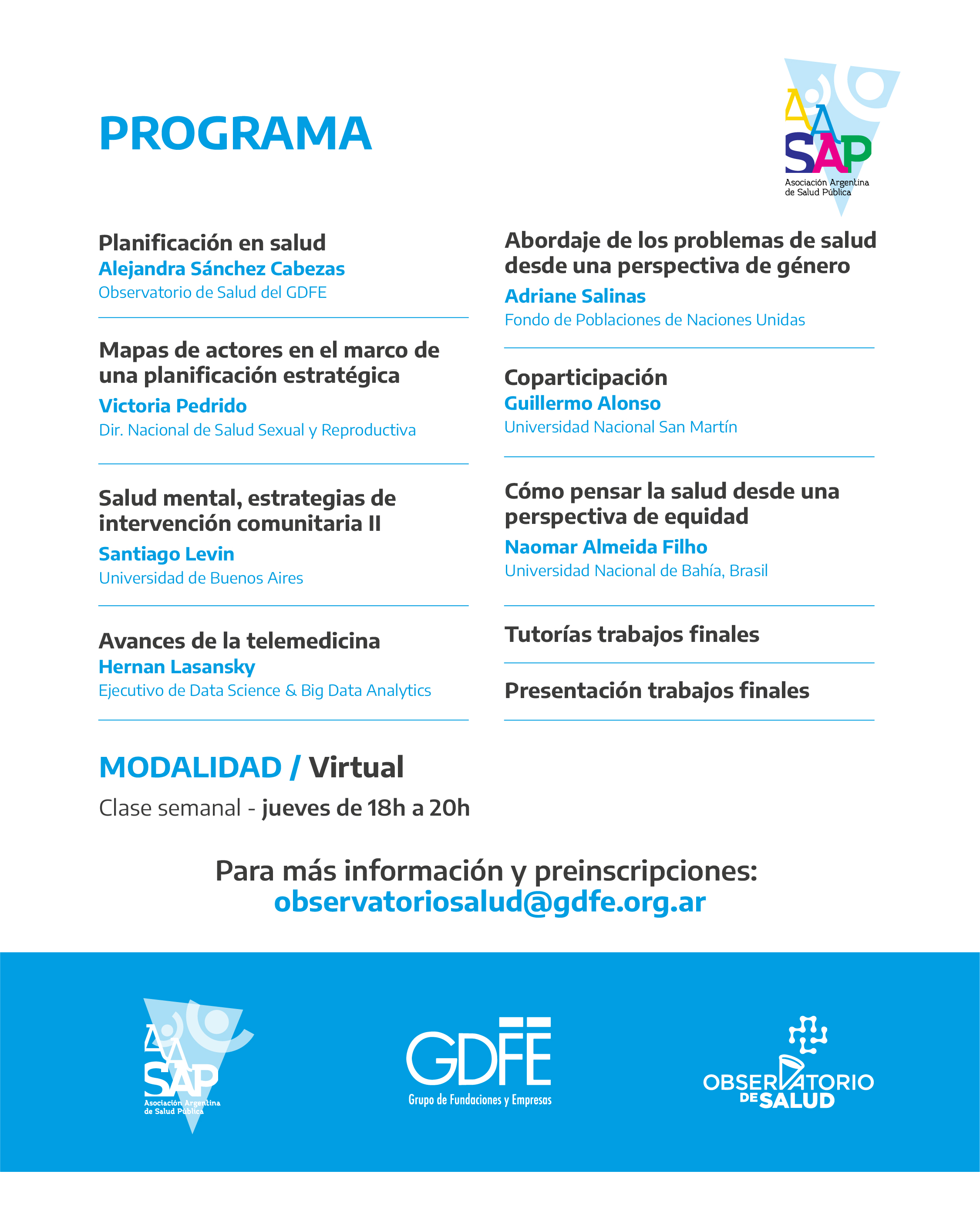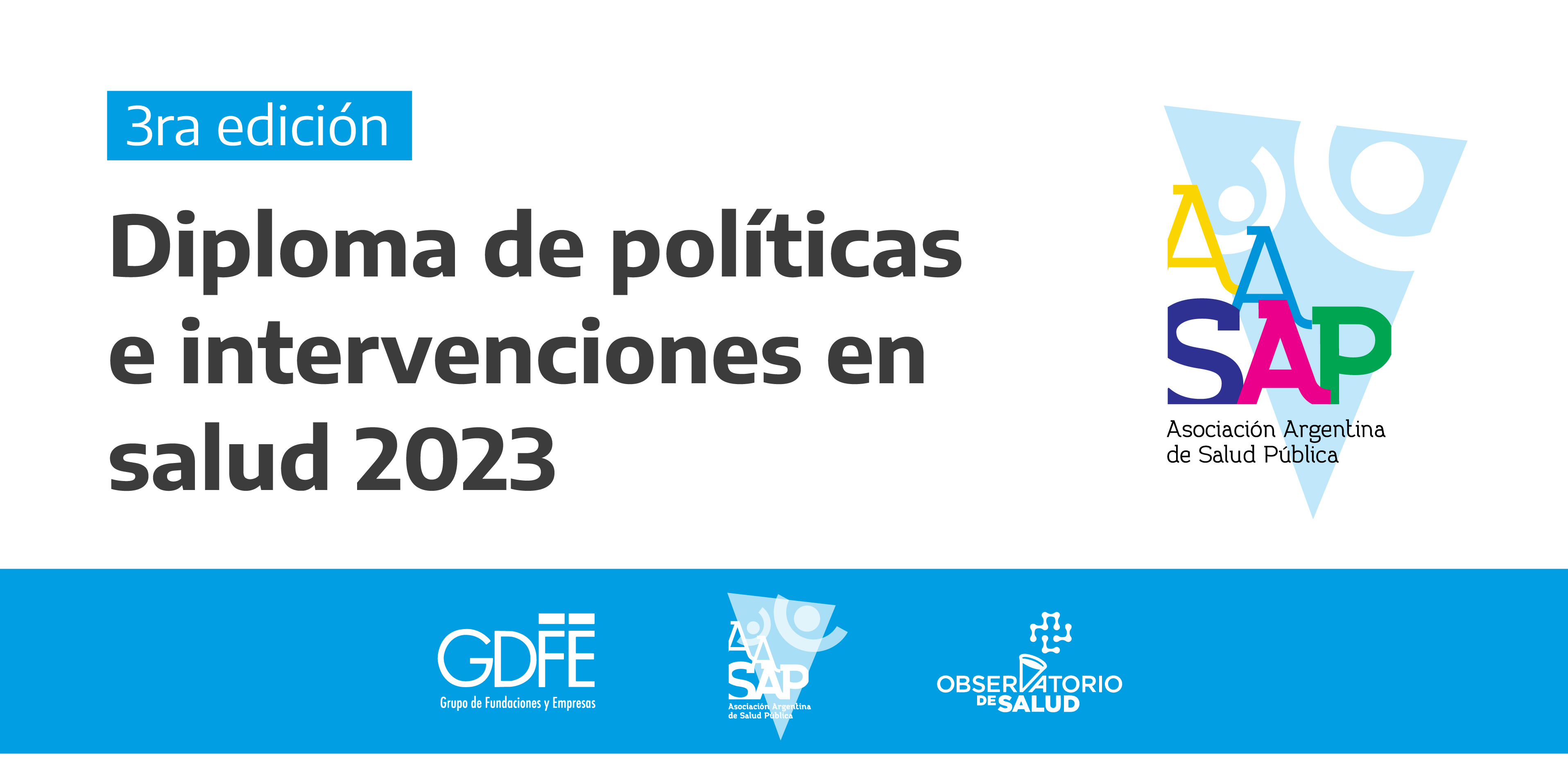 La Asociación Argentina de Salud Pública junto al Observatorio de Salud del Grupo de Fundaciones y Empresas (GDFE) convocan a interesados e interesadas a inscribirse en la Diplomatura en Políticas e Intervenciones de Salud, que se dictará los días jueves de 18 a 20 Hs, entre los meses de junio a diciembre, y está dirigido a referentes de empresas, fundaciones, OSC que trabajan en salud, funcionarias/os provinciales y municipales, asesores legislativos, dirigentes sindicales y periodistas.