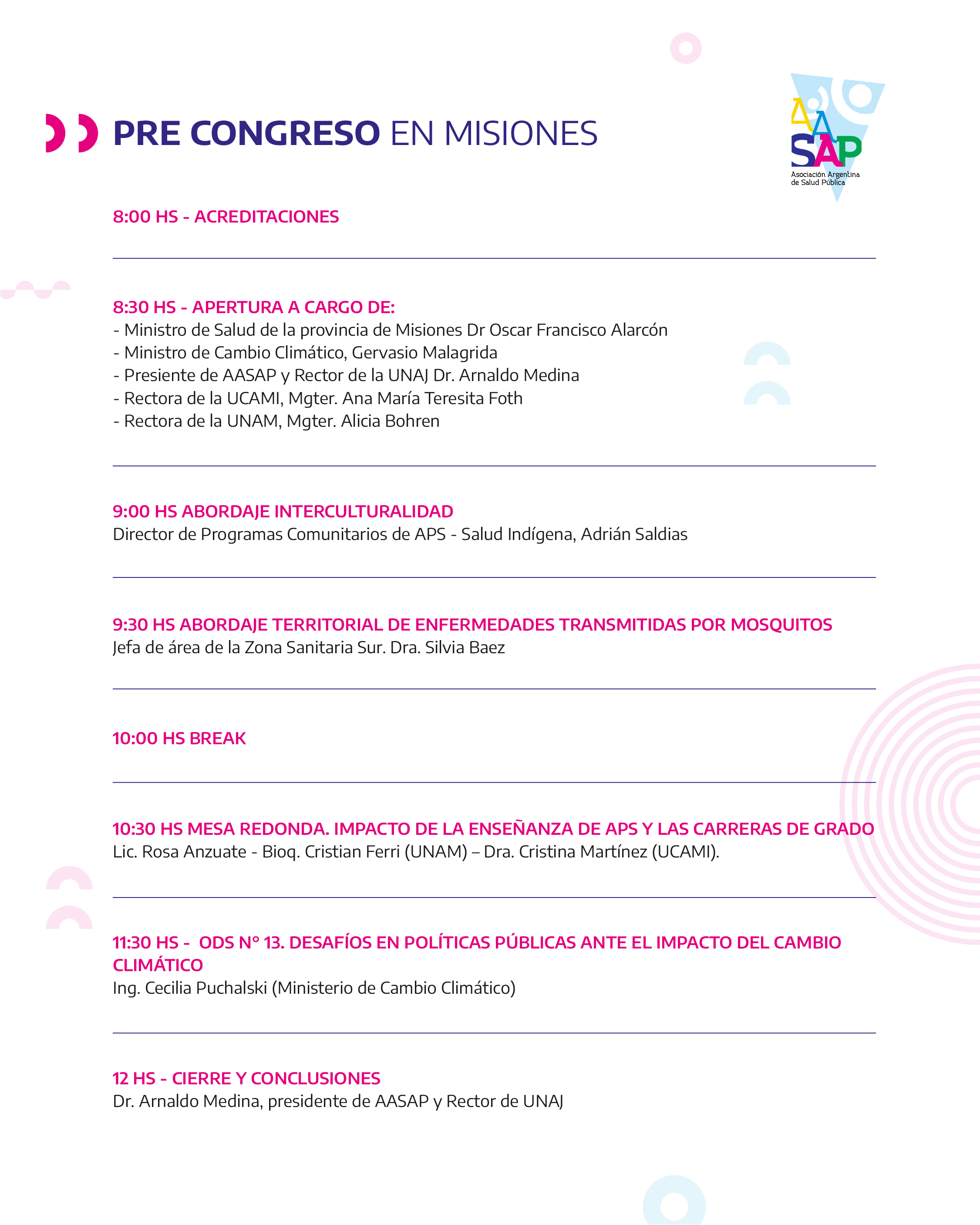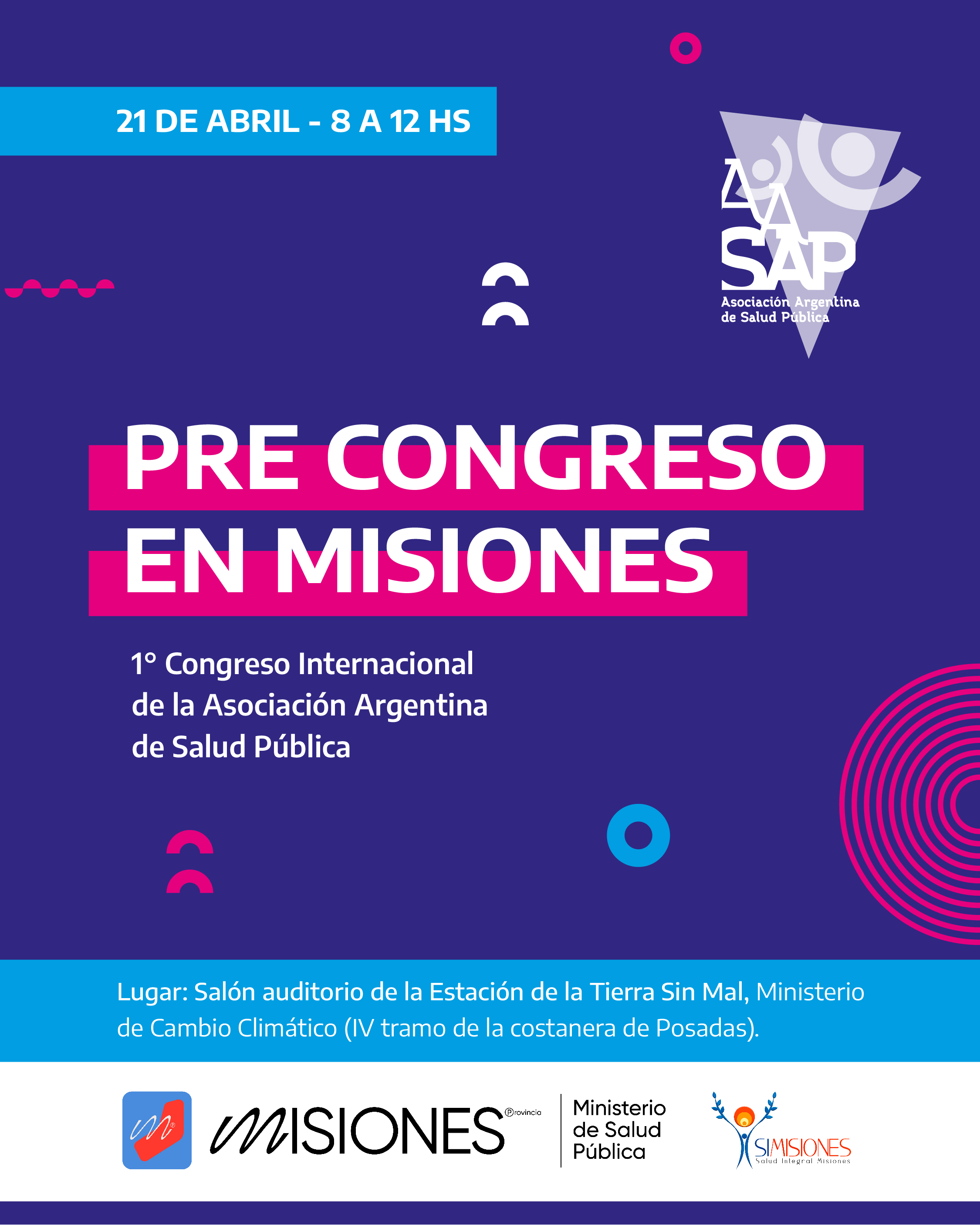 Organizado por AASAP y el Ministerio de Salud Misiones, el Pre Congreso buscará ahondar en las características particulares de la región, en torno a los que serán los ejes centrales del Congreso, que se realizará en el Centro de Convenciones Palais Rouge, en la Ciudad Autónoma de Buenos Aires los días 31 de mayo, 1 y 2 de junio.