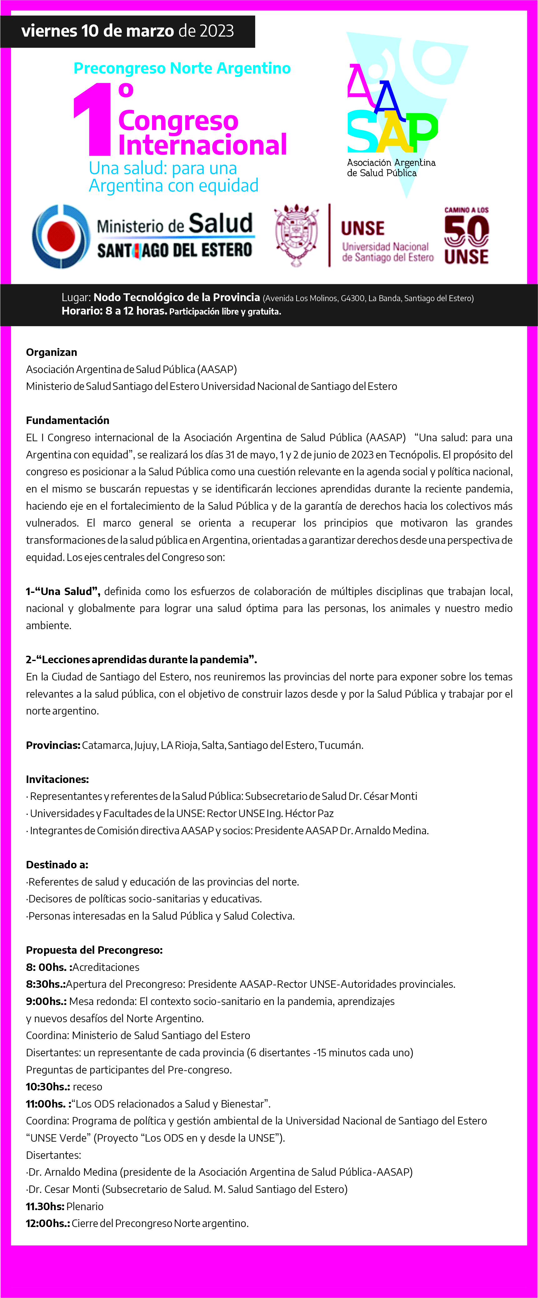 El próximo viernes 10 de marzo tendrá lugar, en la ciudad de Santiago del Estero el Pre Congreso Norte Argentino, del I Congreso Internacional de la Asociación Argentina de Salud Pública “Una salud: para una Argentina con equidad”.