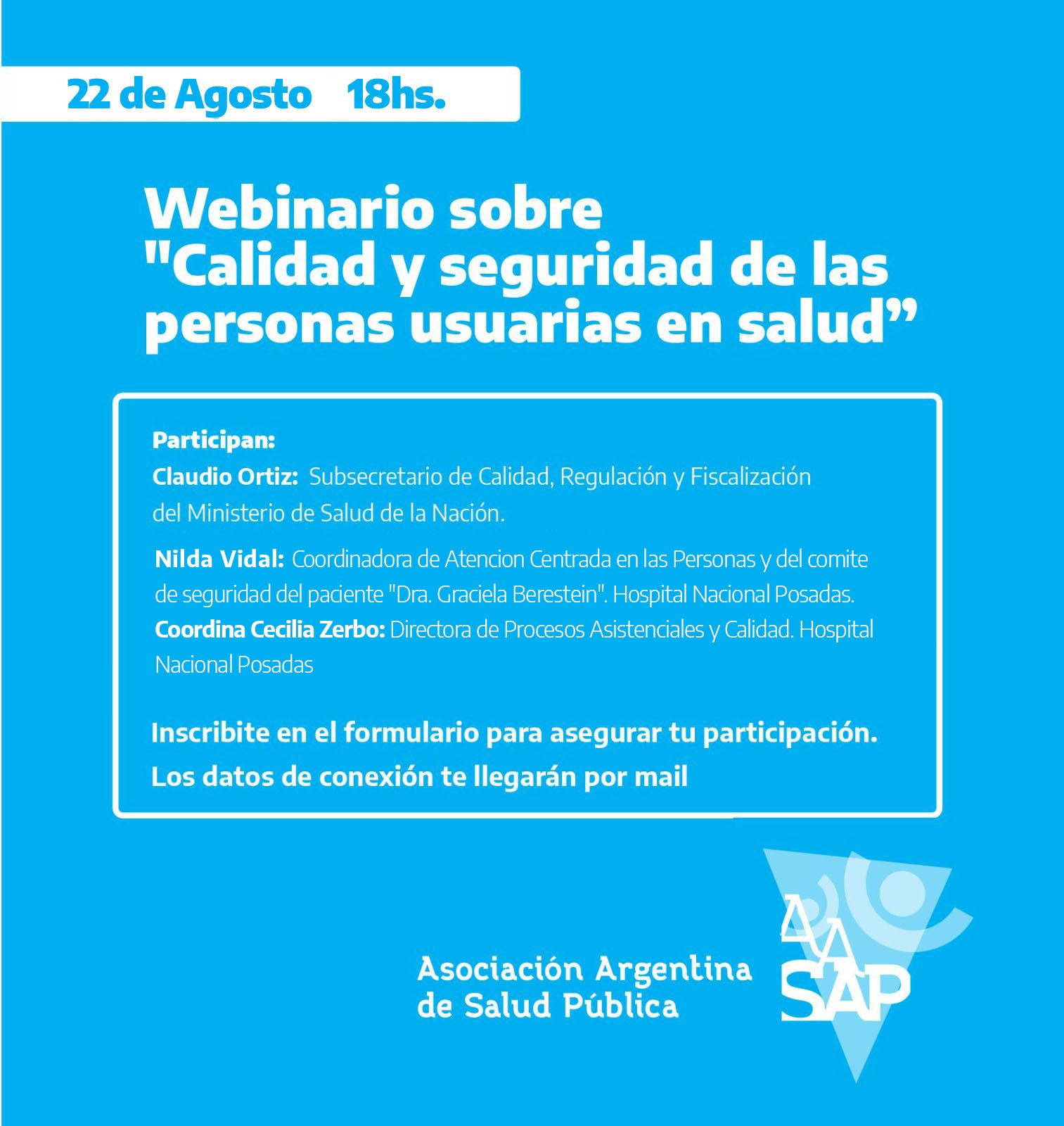 La Comisión Directiva de AASAP se encuentra invitando a socios, socias y también a no socios y no socias a participar de una serie de webinarios con entrada libre y gratuita que se realizarán a partir del 18 de agosto cada dos semanas, y que tendrán como eje diferentes aspectos que hacen a la Salud Pública en nuestro país.